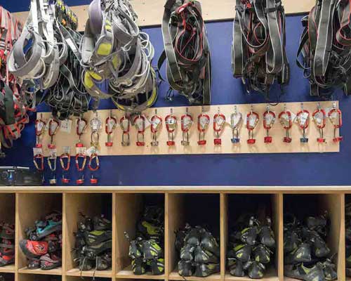 We have all the equipment you will need to get you climbing: Climbing shoes, harness, padded harness, belay & karabiners and chalk bags.